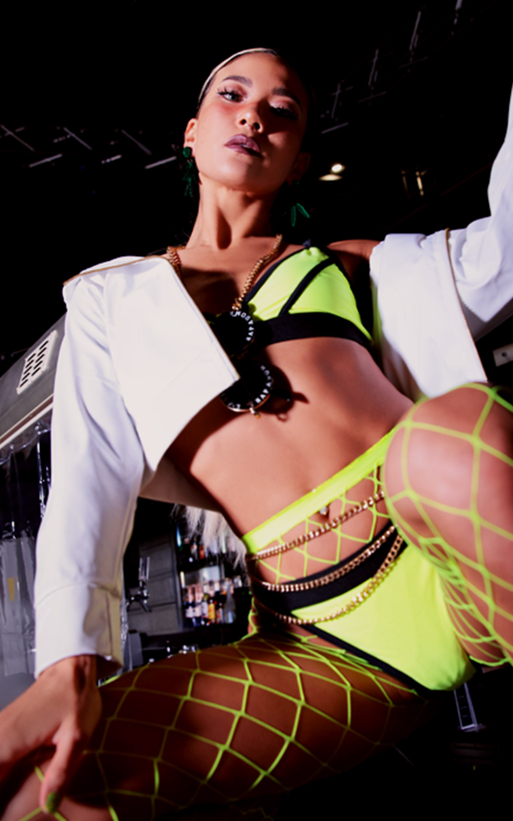 フロントアミアミデザインでダンサーの振りを強調出来るスタイリッシュなシルエット