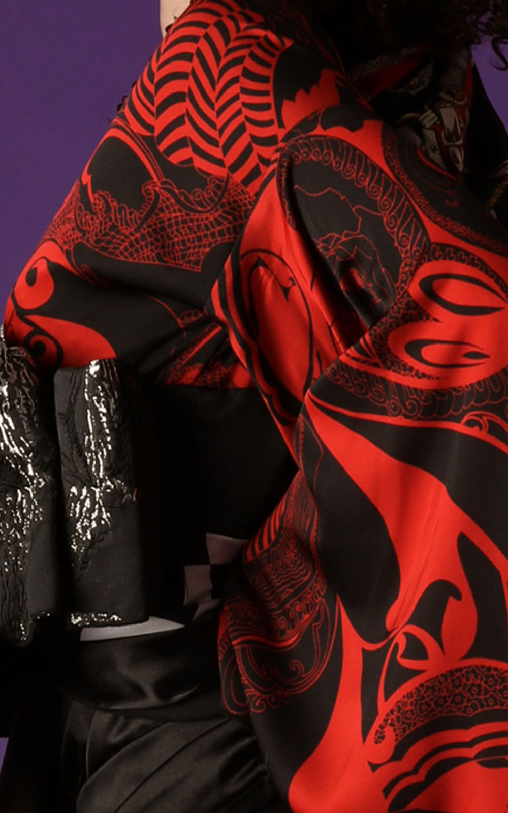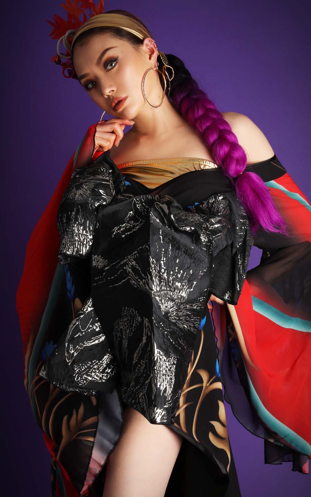 大人しめの柄使い和装衣装にはヘアーにカラーパニエをON. 衣装に使用してないカラー使いでド派手な雰囲気に. ガッツリ空いた胸元にはダンサーお馴染みチョーカーを合わせてcoolに.