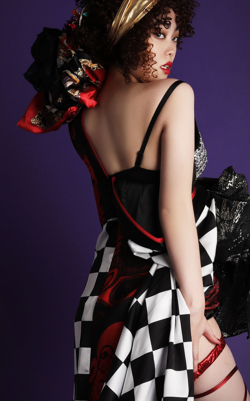 2つの柄をハーフで使った花魁衣装. それだけでも十分映えますが、あえて半分全露出がおすすめコーデ. ビジュたっぷりのビスチェとキラキラ網タイツで豪華絢爛な雰囲気に.